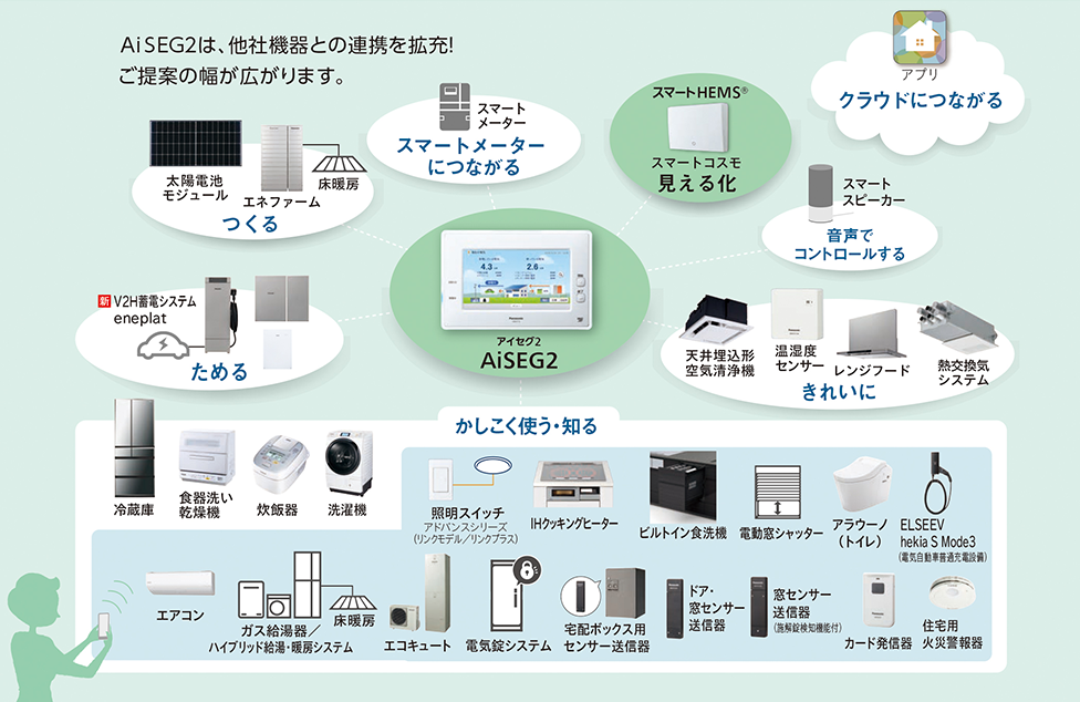 AiSEG2は、IoTやAI対応。便利で快適はもちろん、エネルギーをつくる、ためる、さらにかしこくコントロールすることでくらしをエネルギー視点からサポートします。