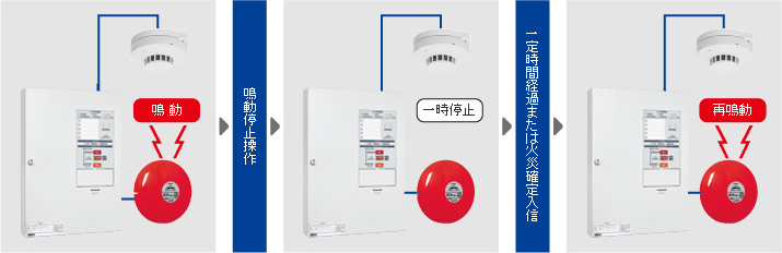 ベル(地区音響)一時停止スイッチを押してベル(地区音響)を一時停止しても、スイッチを押してから一定時間※1 経過後または火災確定信号※2 が入ると、ベル(地区音響)が再鳴動します。