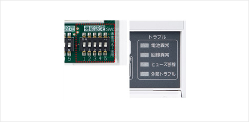 今までは、トラブル表示を番号で表記していましたが、新商品では名称を入れてよりわかりやすくしました。また、トラブル音響鳴動の有無は、本体内のディップスイッチで設定できます。