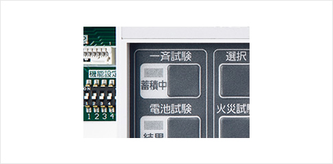 一斉試験スイッチを押すだけで、「火災表示試験」「使用回線表示試験」「ランプ表示試験」「蓄積時間測定試験」「ソフト設定確認」を順番に自動試験。試験時間のスピードアップと省力化を可能にしました。