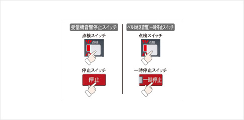 点検スイッチを押しながら受信機音響停止スイッチ〔またはベル(地区音響)一時停止スイッチ〕を押すだけで、音響の強制停止が簡単にできます。