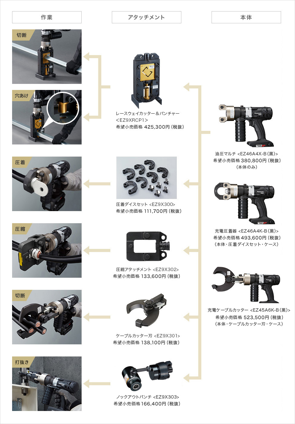 圧着ダイスセットを使用すれば圧着が、圧縮アタッチメント/Tダイスを使用すれば圧縮が、ノックアウトパンチを使用すれば打抜きが、レースウェイカッター&パンチャーを使用すれば切断、穴あけが可能です。