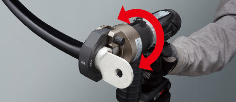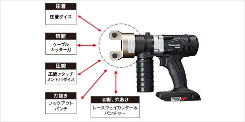 先端のアタッチメントを換えるだけで「圧着」「切断」「圧縮」「打抜き」が可能