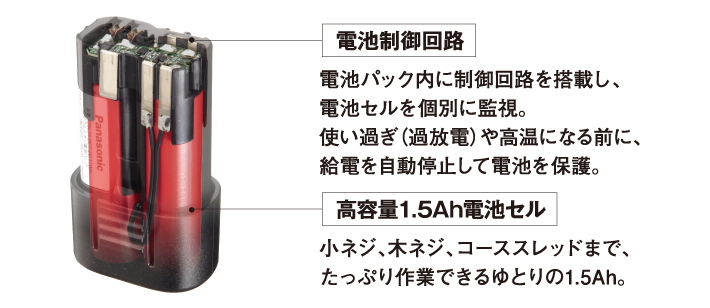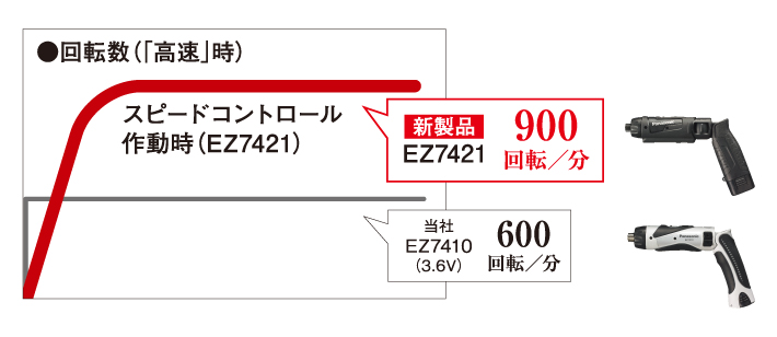 当社3.6V ES7410に比べて出力※2倍、「高速」時の回転数は1.5倍。ストレスのないスピーディな作業を支援。