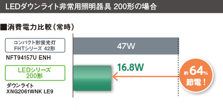 LEDダウンライトとLED非常灯の機能を合わせ持った、業界初の常時・非常時兼用 電池内蔵形LEDダウンライト非常用照明器具です。常時・非常時ともにLED点灯して、従来の蛍光灯タイプからおよそ70%もの大幅な節電が可能になります。