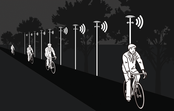 セキュリティ性を高めながら、省エネ性もしっかりと高めました。例えば、監視カメラは夜も稼動しますが、人や車が通らない時は減光。近づいてきたらセンサーが感知して照明をフル点灯し、人や車の進行に合わせて街路灯が次々と明かりのリレーをしていきます。さらに、連動する監視カメラが、撮影物に画角をあわせて対象となる人や車を確実に見守っていきます。