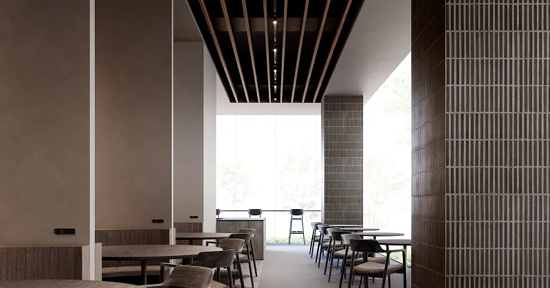 ルーバー天井に設けられた配線ダクトはカフェに求められる電気設備を統合し、空間の美しさを引き立てます。