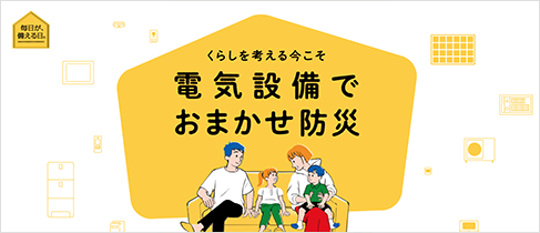 毎日使う電気設備が自然災害のときの助けになること、知ってますか?くらしを考えるいまこそ、無理なく防災を始める絶好のタイミング。おまかせ防災で、「毎日が、備える日」に。