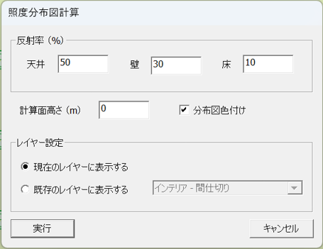 - 計算時の反射率、計算⾯⾼さ、レイヤー設定などを⼊⼒し、「実⾏」ボタンを押します。