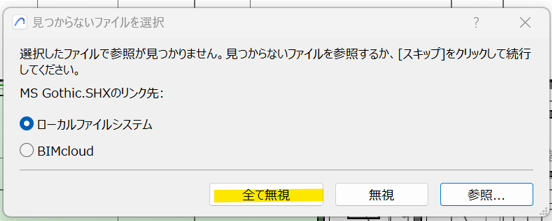 フォント参照が⾒つからない場合は警告画⾯が表⽰されますが、「全て無視」を選択してください。
