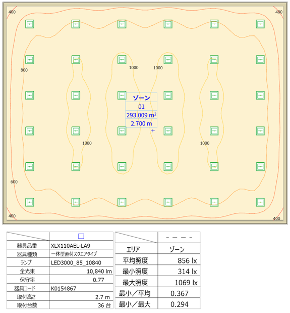 - 計算結果が照度分布図として表⽰されます。