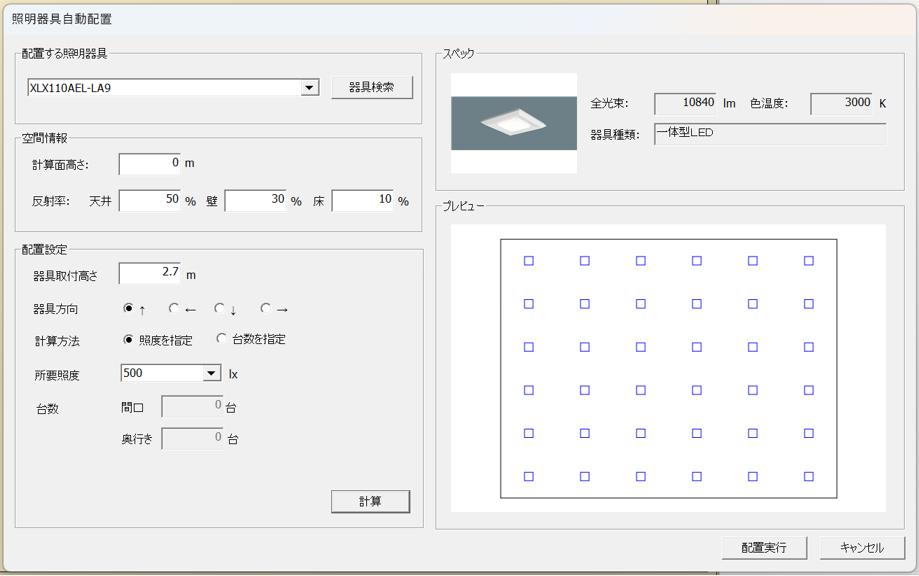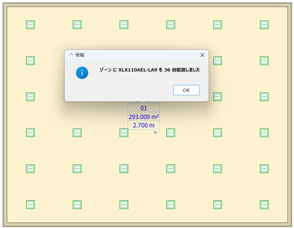 - 「配置実⾏」ボタンを押すと、計算結果に基づき照明器具が⾃動配置されます。
