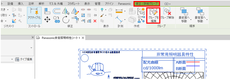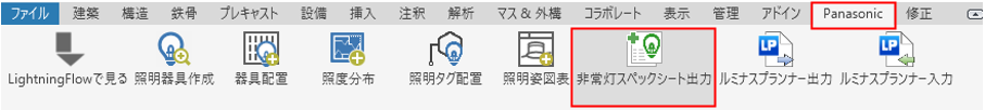 - プロジェクトを表⽰した状態で、「Panasonic」タブ内の「⾮常灯スペックシート出⼒」ボタンを押します。