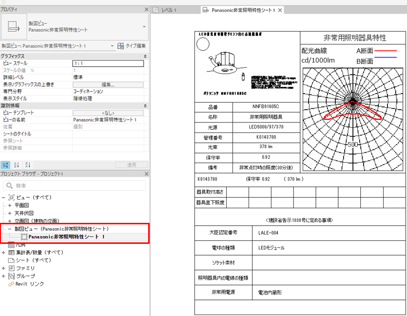 製図ビュー内に⾮常灯スペックシートが作成されます。