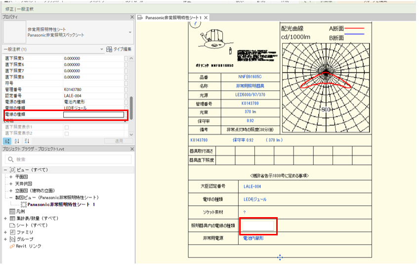 相互に連携しているため、スペックシートから編集した場合でも⾮常照明器具のタイプパラメータに反映され、