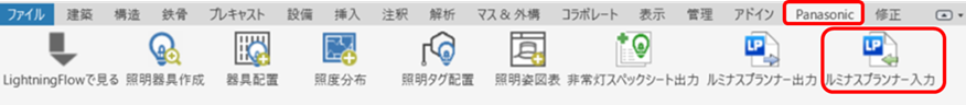 - Revitに戻り、「図面ビュー」(「平面図ビュー」・「天井伏図ビュー」)もしくは「3Dビュー」を開いた状態で、「Panasonic」タブ内の「ルミナスプランナー入力」ボタンを押します。