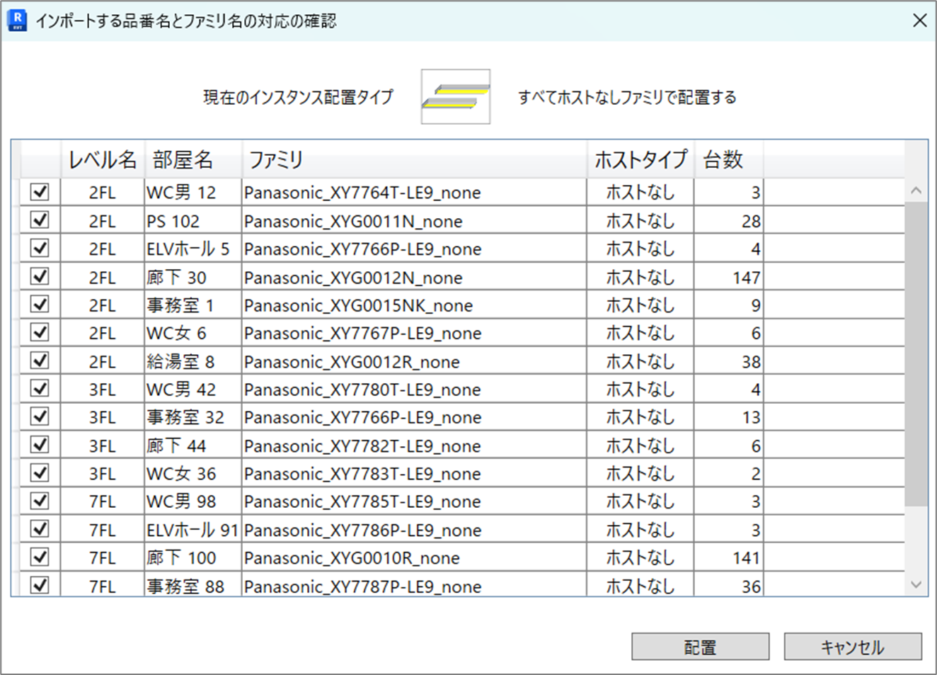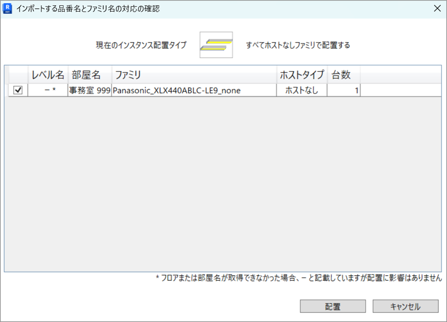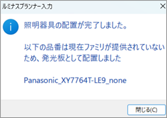ファミリが提供されていない照明器具が⼊⼒対象に含まれていた場合は以下のような画⾯が表⽰され、対象の器具を発光板として配置します。