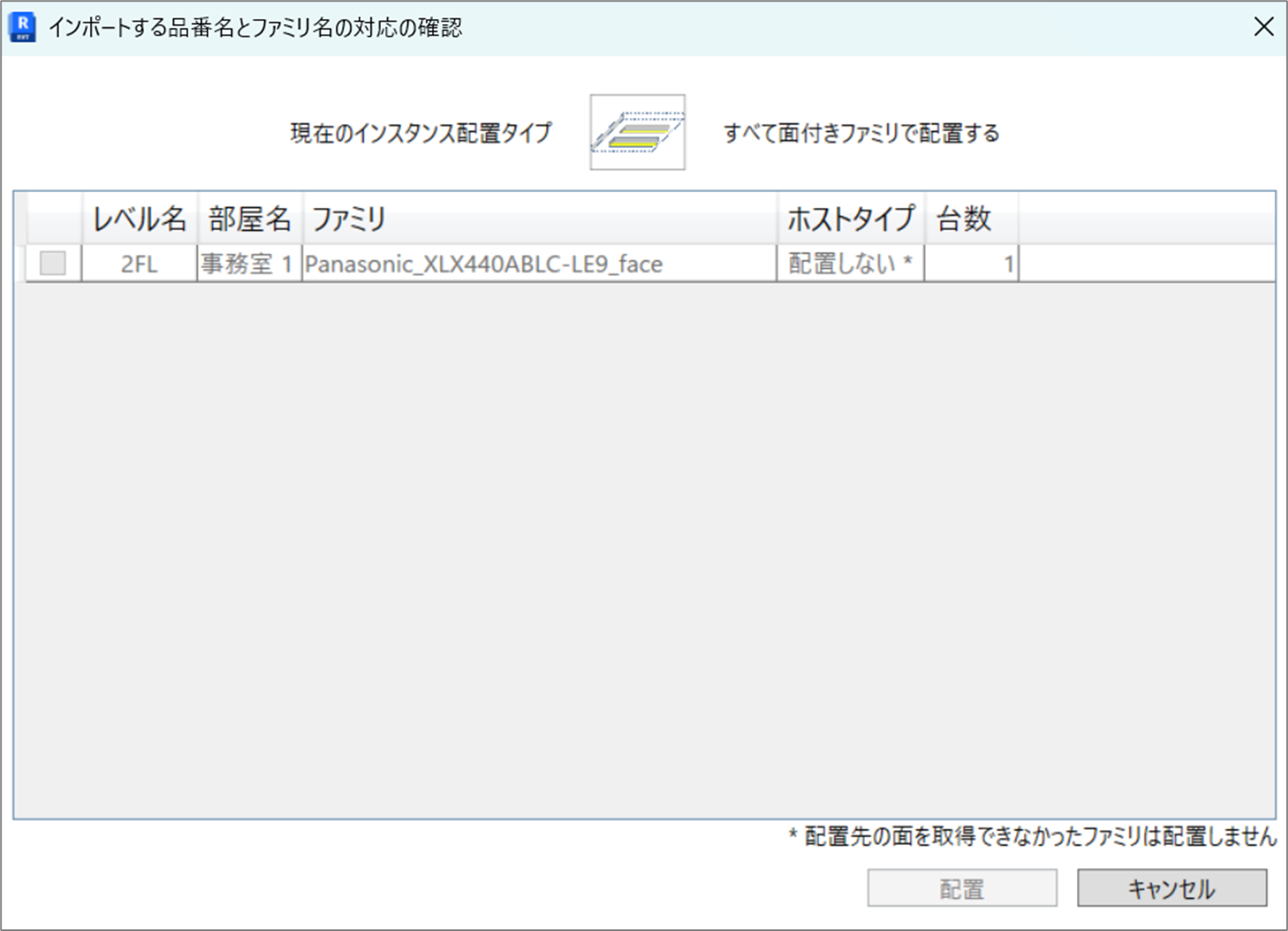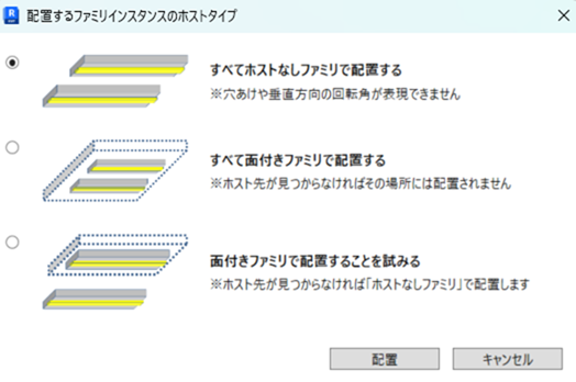 - "すべて⾯付きファミリで配置する" もしくは "⾯付きファミリで配置することを試みる" が選択されている状態で