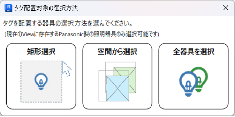 :アクティブビュー上でドラッグし、範囲内の照明器具をまとめて選択します。 :アクティブビューに表⽰されている空間要素(部屋/スペース)を選択し、その内部にある照明器具を選択します。 :アクティブビュー内のすべてのPanasonic製照明器具を⼀括で選択します。 |