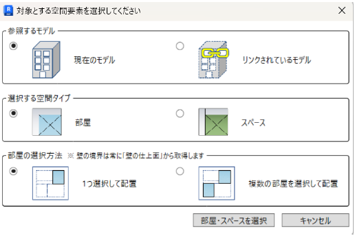 : 部屋・スペースを1つ選択し、その中に存在するタグ配置対象を取得します。 : 選択した複数の部屋・スペースに存在する配置対象を取得します。 |