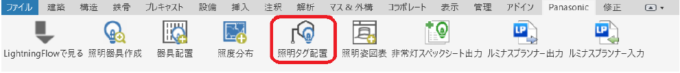 プロジェクトを表⽰した状態で、「Panasonic」タブ内の「照明タグ配置」ボタンをクリックします。