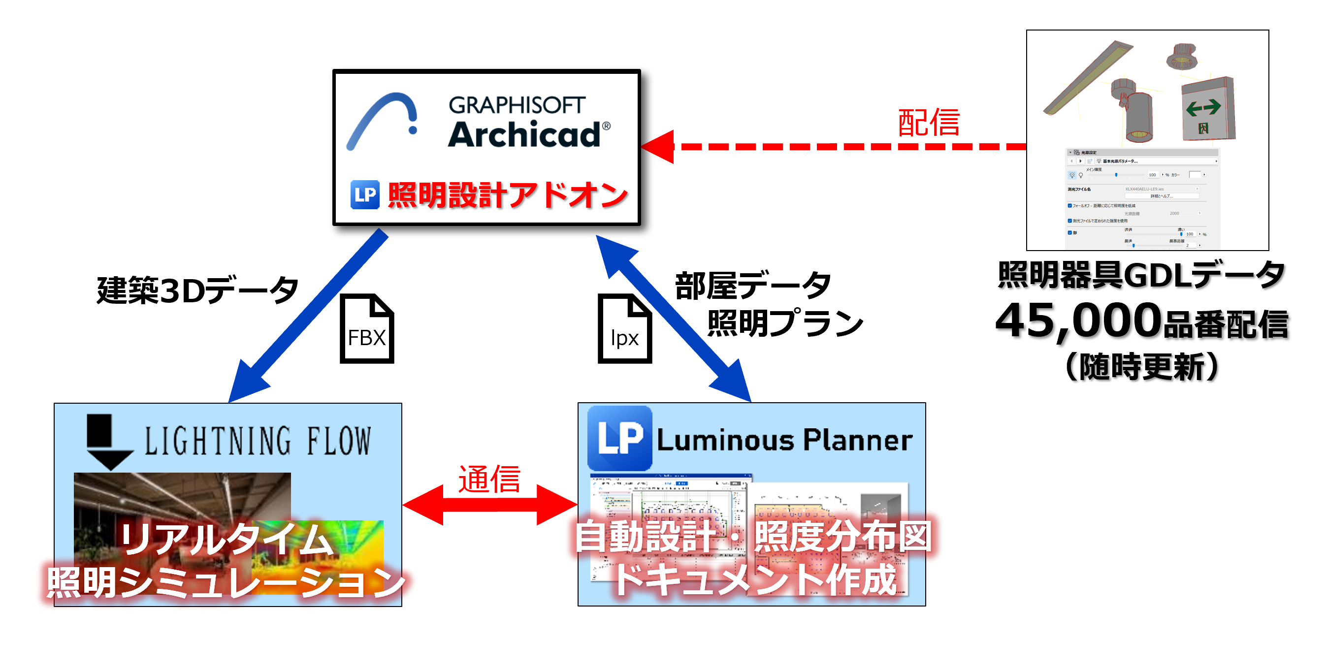 ArchicadからFBXファイルで建築形状を書出し、照明情報はルミナスプランナーや設備CADから書出す必要があります。