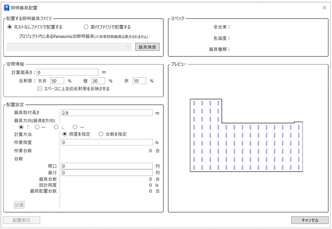 部屋ごとに必要な平均照度を設定することで、必要台数を割り出して照明器具を自動配置します。