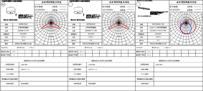 プロジェクトに配置されている当社製の非常用照明器具のスペックシートを出力します。