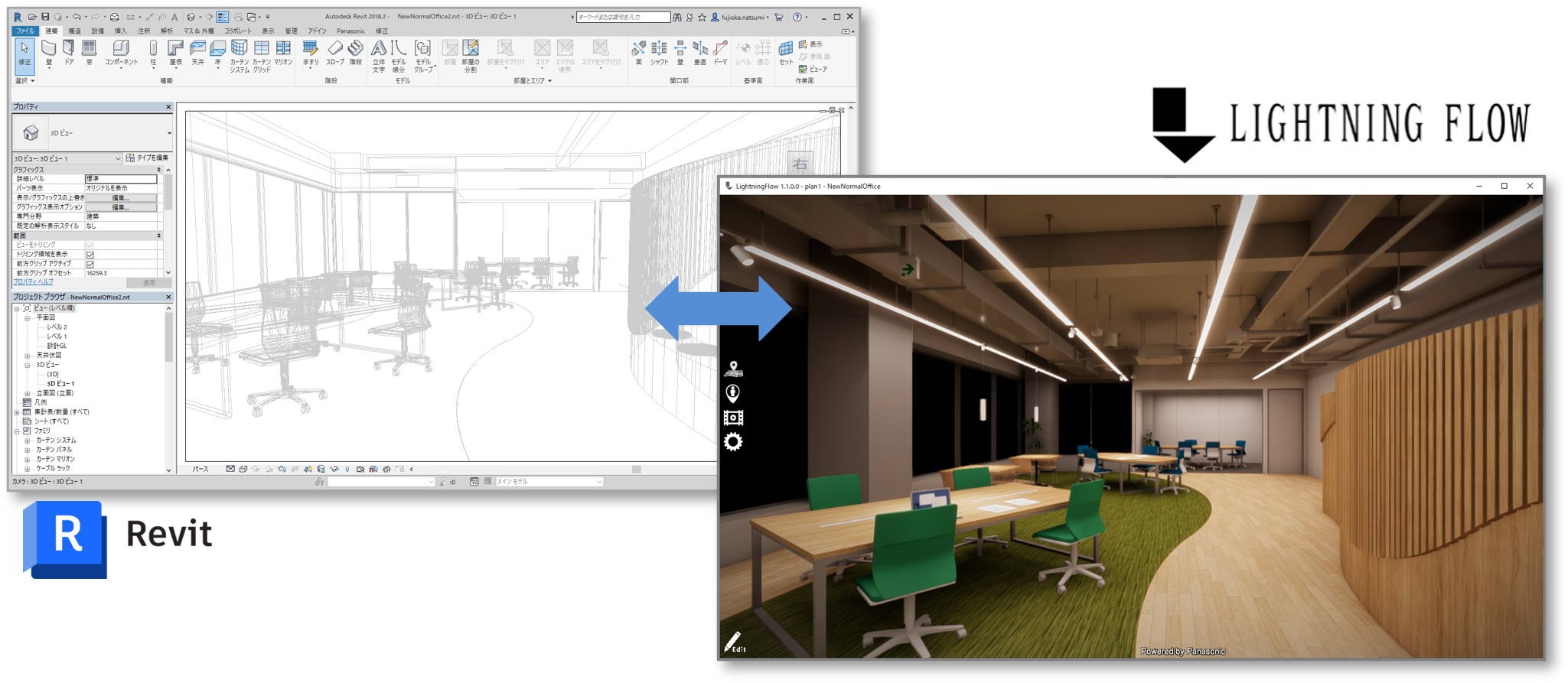 リアルタイムに照明シミュレーション・建築ビジュアライゼーションを行える「ライトニングフロー」とファイルを介さず双方向でデータ通信を行えます。