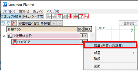 フロア「挿入」→「部屋(所要台数計算)」を選択します。