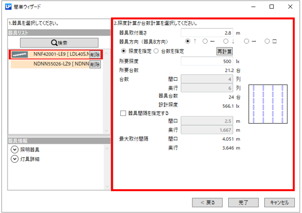 「台数」に間口・奥行の各方向に対して器具の配列数を指定することで設計照度を計算します。