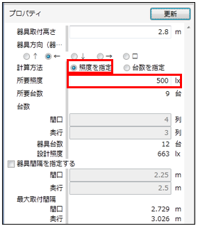 【照度を指定】 プロパティの「照度を指定」を選択し、必要照度を設定後、 「更新」をクリックします。 所要台数や設計照度など計算結果が変わります。