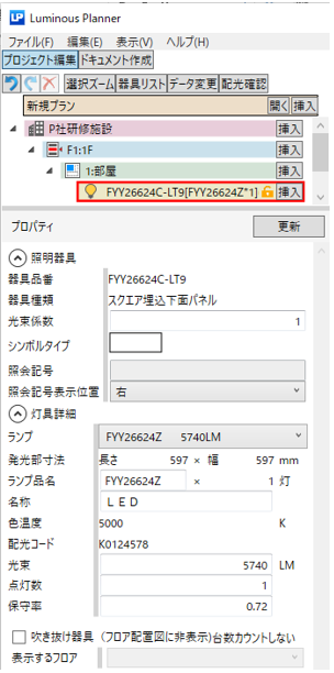 ツリーの照明器具(例:FYY26624C-LT9(100-242_V))をクリックすると、 プロパティに器具の設定情報が表示されます。 照度分布図上に表示する器具を現す線の色や光束・保守率など設定できます。 照明器具 【照会記号】 器具リストで設定した照会記号が表示されます。 【照会記号表示位置】 照会記号の表示位置を設定できます。 灯具詳細 【ランプ】 プルダウンからランプが選択できます。 【吹き抜け器具(フロア配置図に非表示)台数カウントしない】 吹き抜け天井の際、該当の器具表示を別フロアに設定できます。 例:照度計算は1階の部屋、器具の設置(表示)は2階の場合など。 |