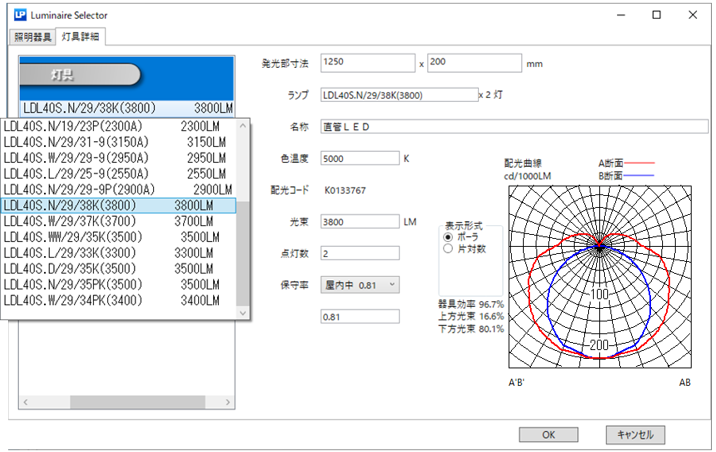 灯具項目の下にあるプルダウンメニューから使用するランプを選択してください。