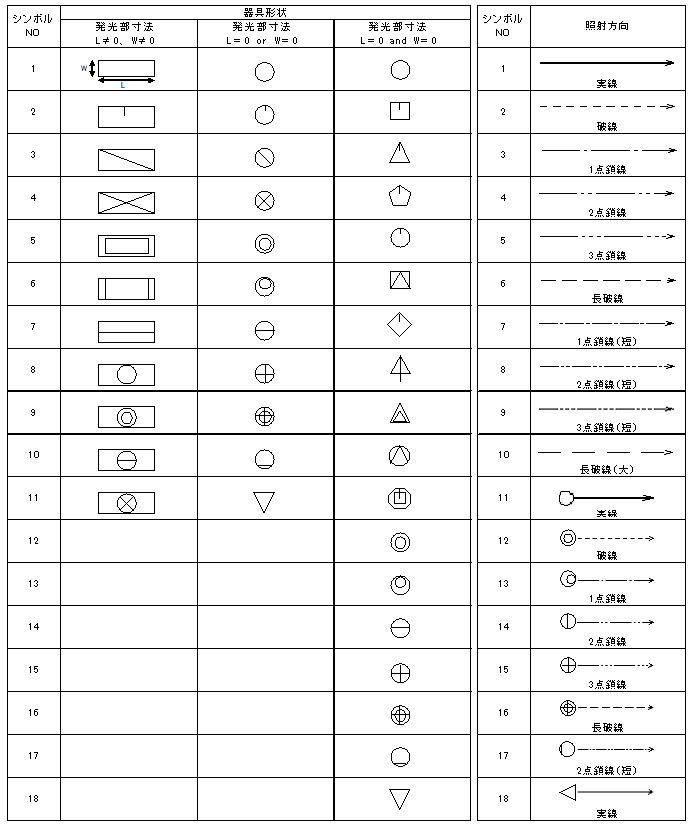 「シンボルタイプ 器具形状」…発光部寸法が0以外のときは長方形で表示され、0のときは記号で表示されます。