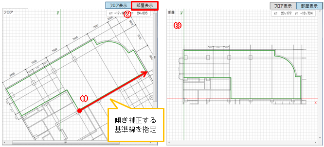 ③メインビューに傾き補正された部屋/スペースを表示します。