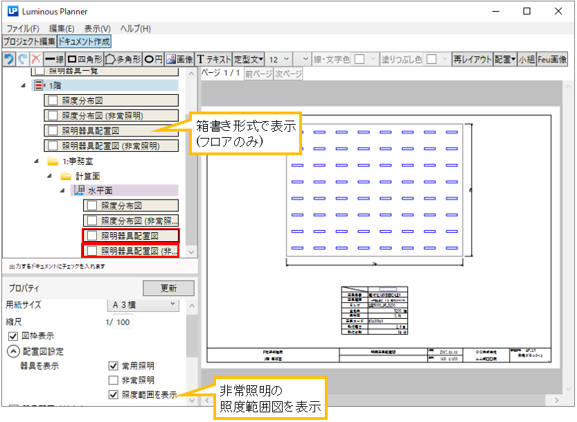 非常灯配置図の常用器具の表示 非常灯配置図に常用照明を表示した場合、常用照明はグレーで表示されます。