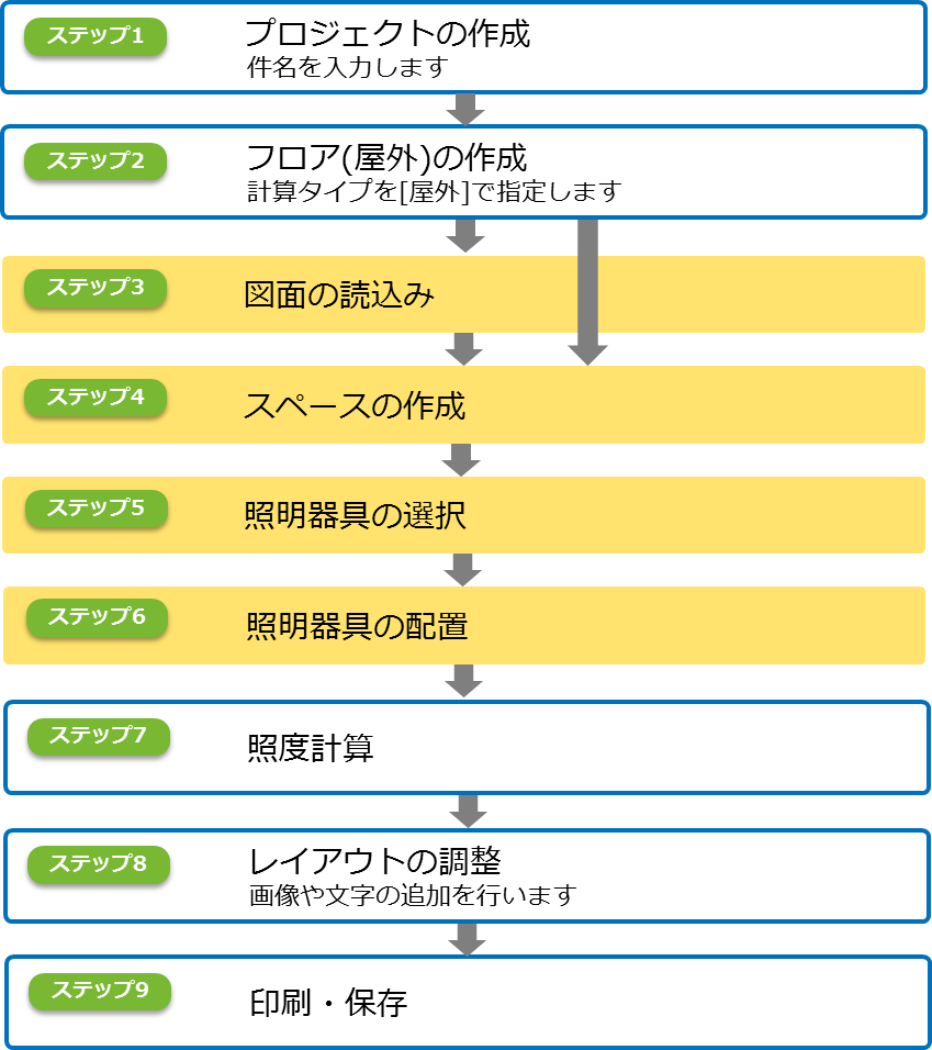 屋外の計算タイプの場合、次の手順でプランを作成していきます。
