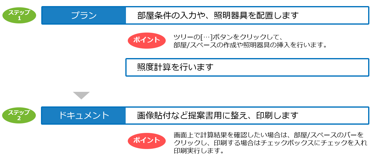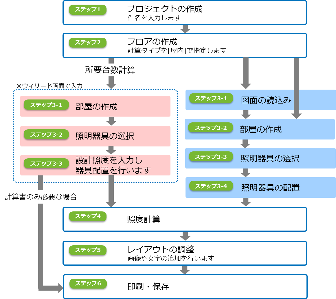 屋内の計算タイプの場合、次の手順でプランを作成していきます。