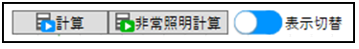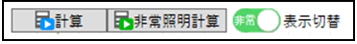 :計算ボタンをクリックして、照度計算を行います。 選択ツリー配下の全計算面を計算します。 (例)フロアを選択して計算すると全ての部屋を計算します。 計算面個別で計算する場合は、フローティング画面の計算ボタンを使用します。 非常照明計算を行った場合は、表示切替ボタンが表示されます。ボタンをクリックして計算結果を切替え確認します。