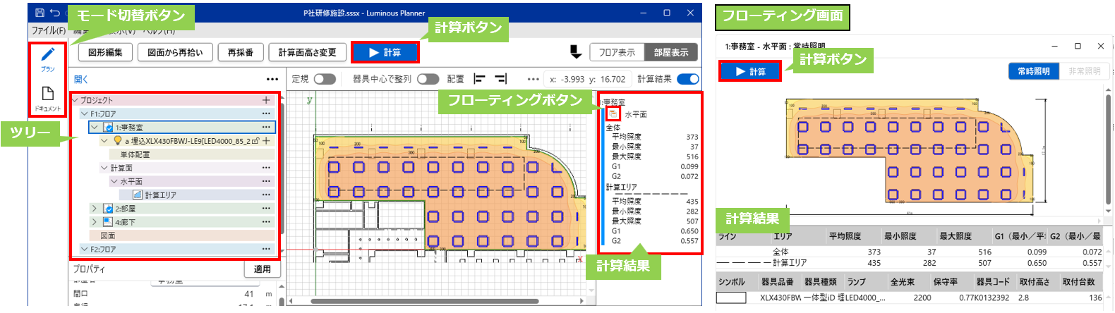 [プラン]モードの照度計算後の画面構成