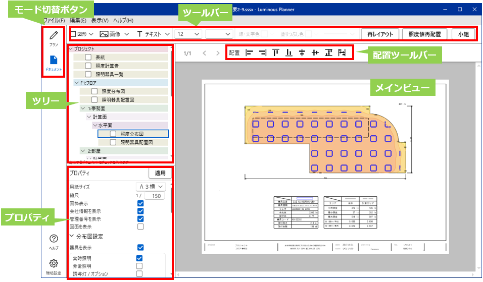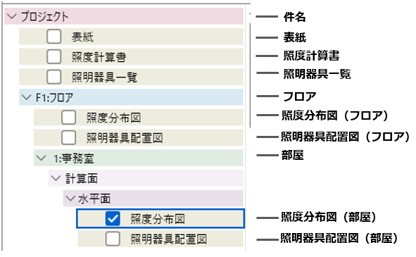 :照度計算書、照度分布図、照明器具配置をフロアと部屋単位で、ツリー状に表示します。