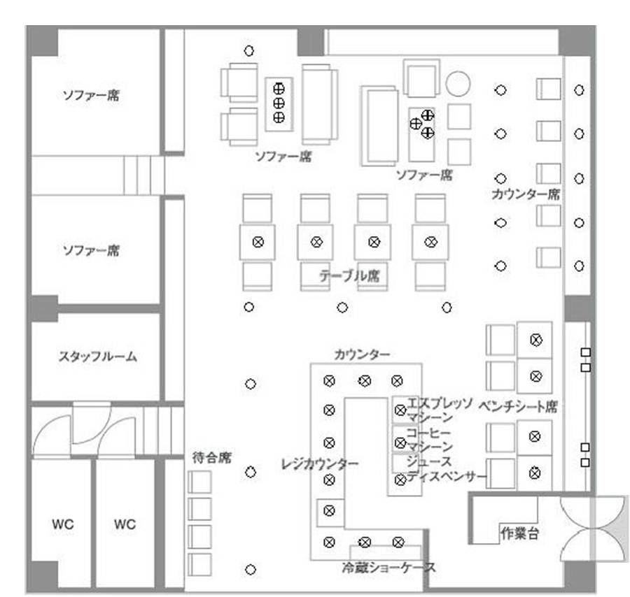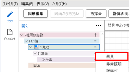 「部屋」(例:カフェ)にある「…」をクリックし、「器具」を選択します