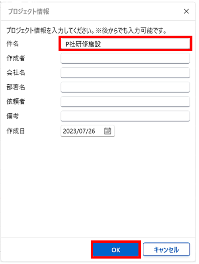 1. [プロジェクト情報]ダイアログが開きますので、「件名」(例:P社研修施設)を入力し「OK」をクリックします。