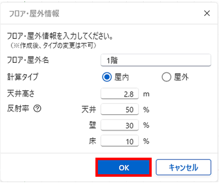 1. [フロア・屋外情報]ダイアログが開きますので、次のように設定します。