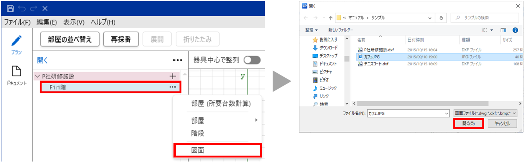 1. ツリーに「フロア」(例:1階)が作成されますので、「…」をクリックし「図面」を選択します。