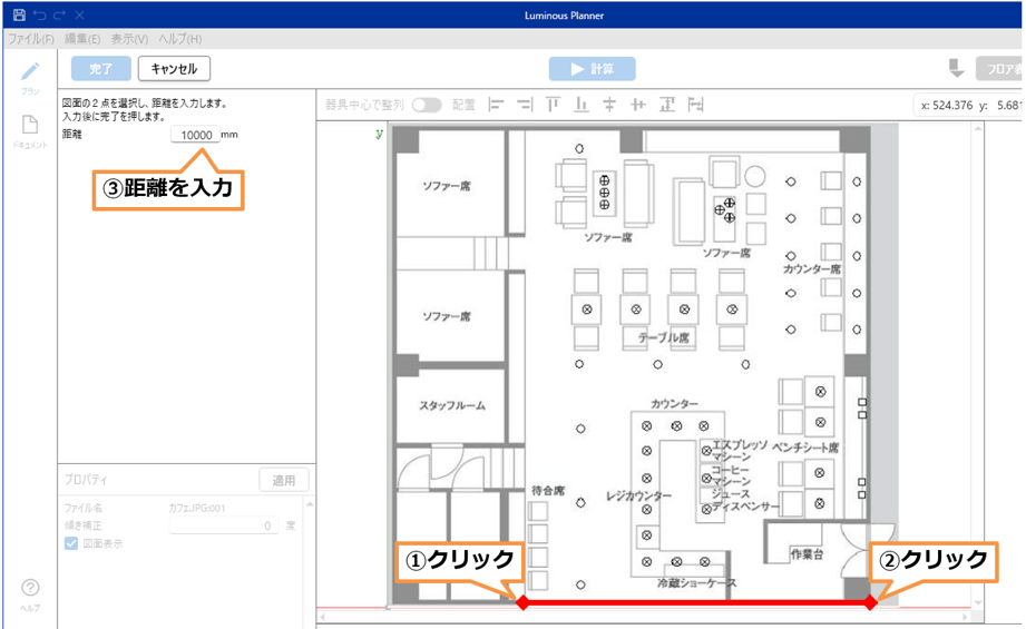 図面上の2点をクリックして指定し、2点間の「距離」をミリ単位で入力します。