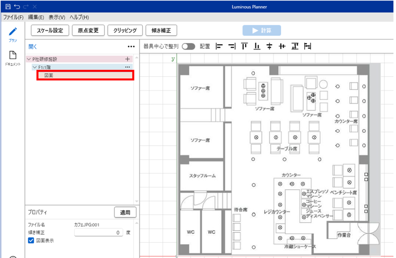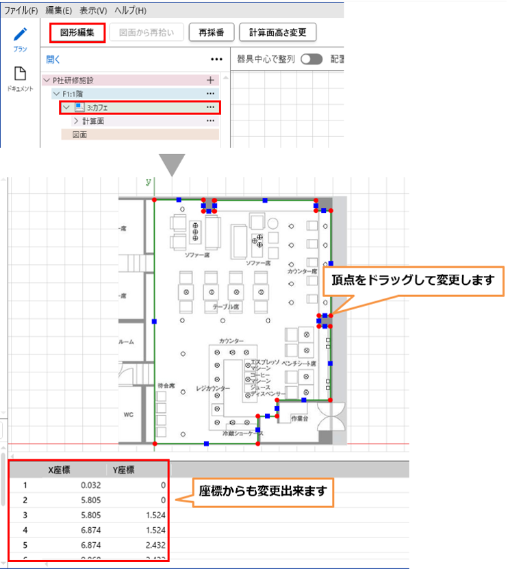 ツリーの「カフェ」を選択後、画面上部に表示される「図形編集」をクリックし、