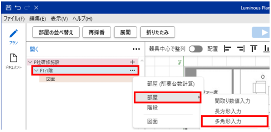 ツリーの「フロア」(例:1階)にある「…」をクリックし、「部屋」-「多角形入力」を選択します。