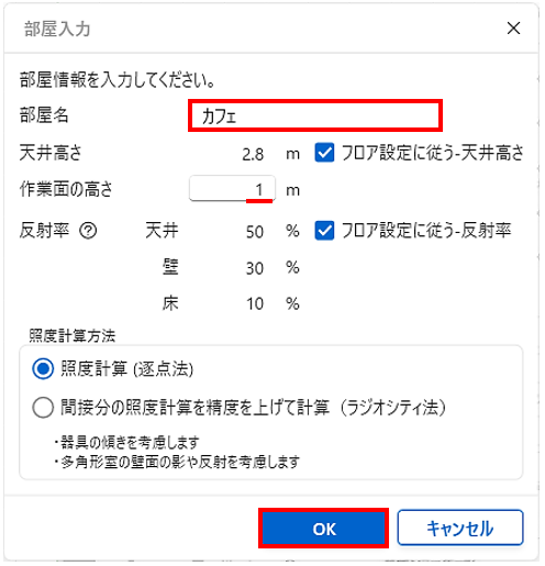 部屋名と作業面の高さを入力し、「OK」をクリックします。